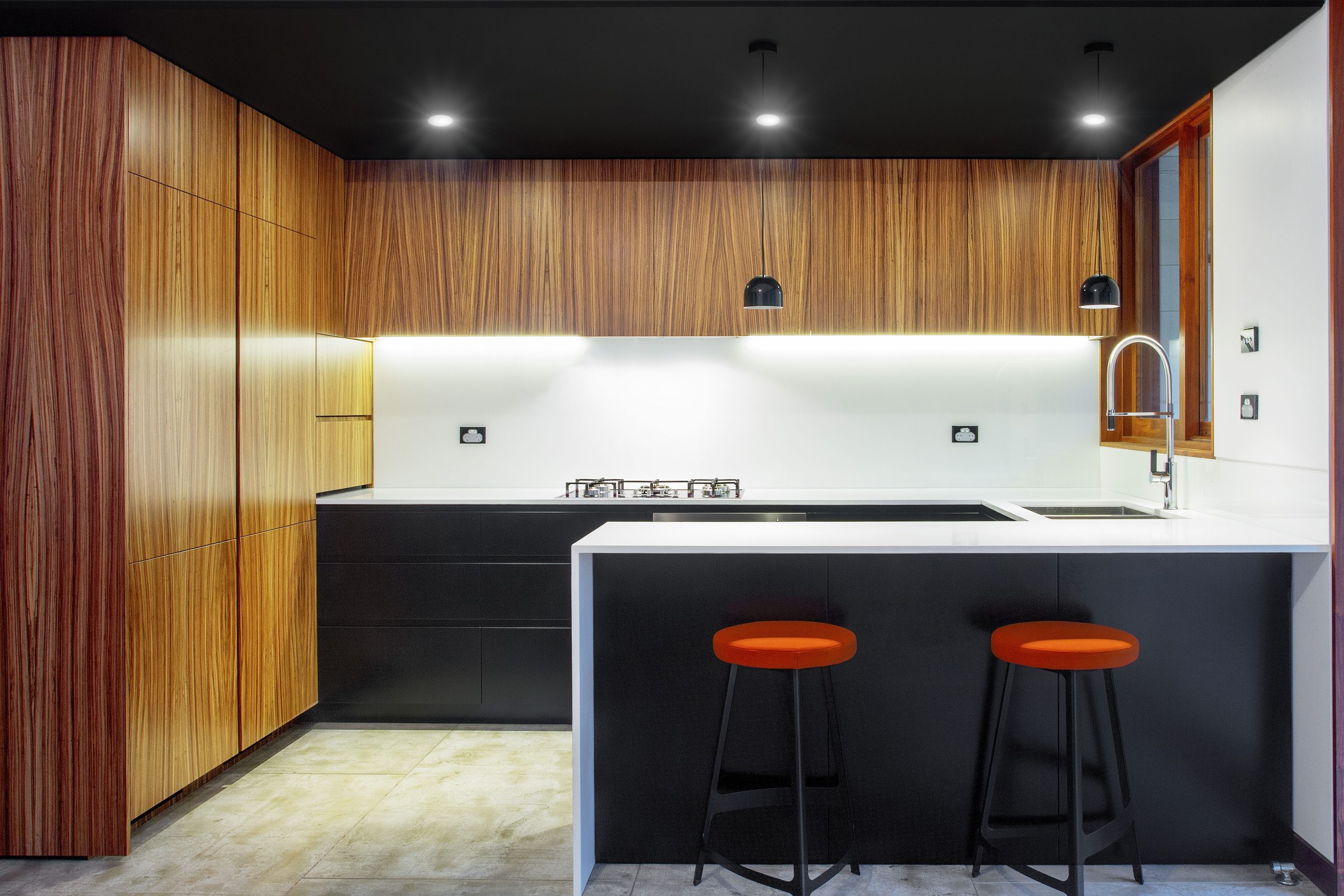 Gwinganna is a new house saddled on a rock platform with spectacular views east and west. Designed as two lineal pavilions separated by a communal courtyard and linked by a glass breezeway. The eastern street-facing pavilion nestles into the gums and houses the sleeping quarters - quiet and private. The western pavilion opens to expansive views over Gadigal National Park - the entertaining space with generous kitchen, dining, living and outdoor entertaining areas. We were careful with the site: minimal excavation, minimal tree loss, working with the existing landscaped typography. Rammed earth base grounds the pavilions, dark aluminium cladding on the first floor to recess into the tree canopy.